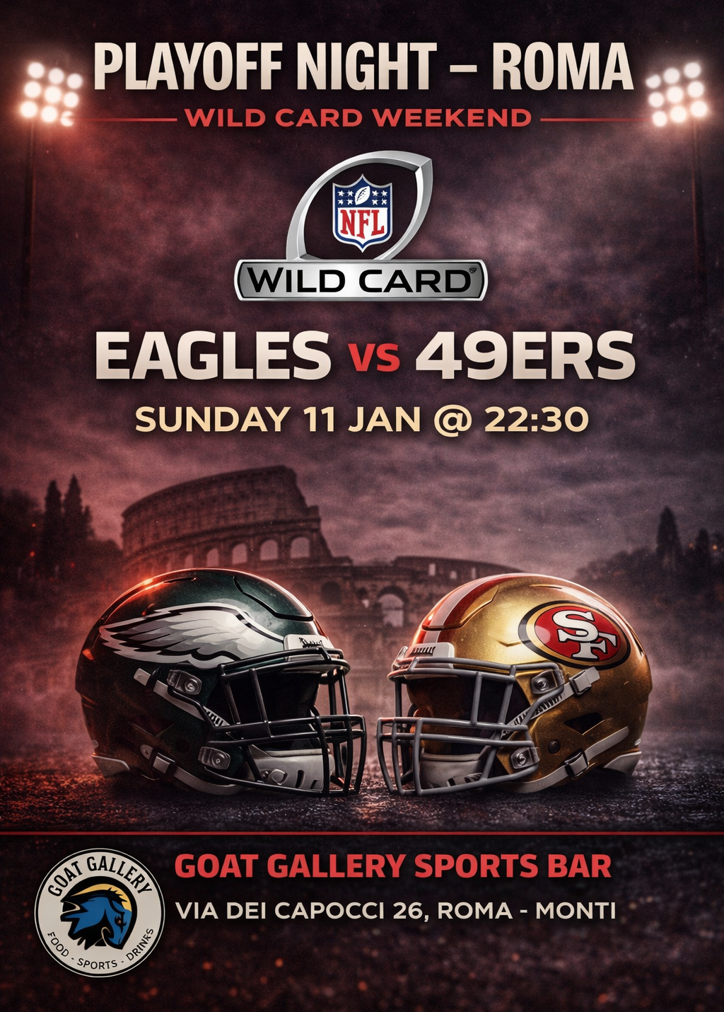 Vivi l’evento live con lo streaming della partita al Goat Gallery Sports Bar, nel cuore di Roma, tra schermi, american food e fans per un’atmosfera da perfetta game night.