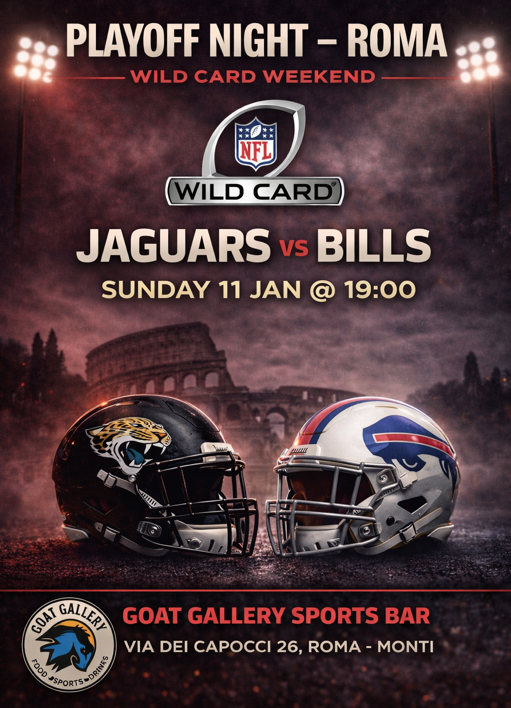 Vivi l’evento live con lo streaming della partita al Goat Gallery Sports Bar, nel cuore di Roma, tra schermi, fans e american food per un’atmosfera da perfetta game night.