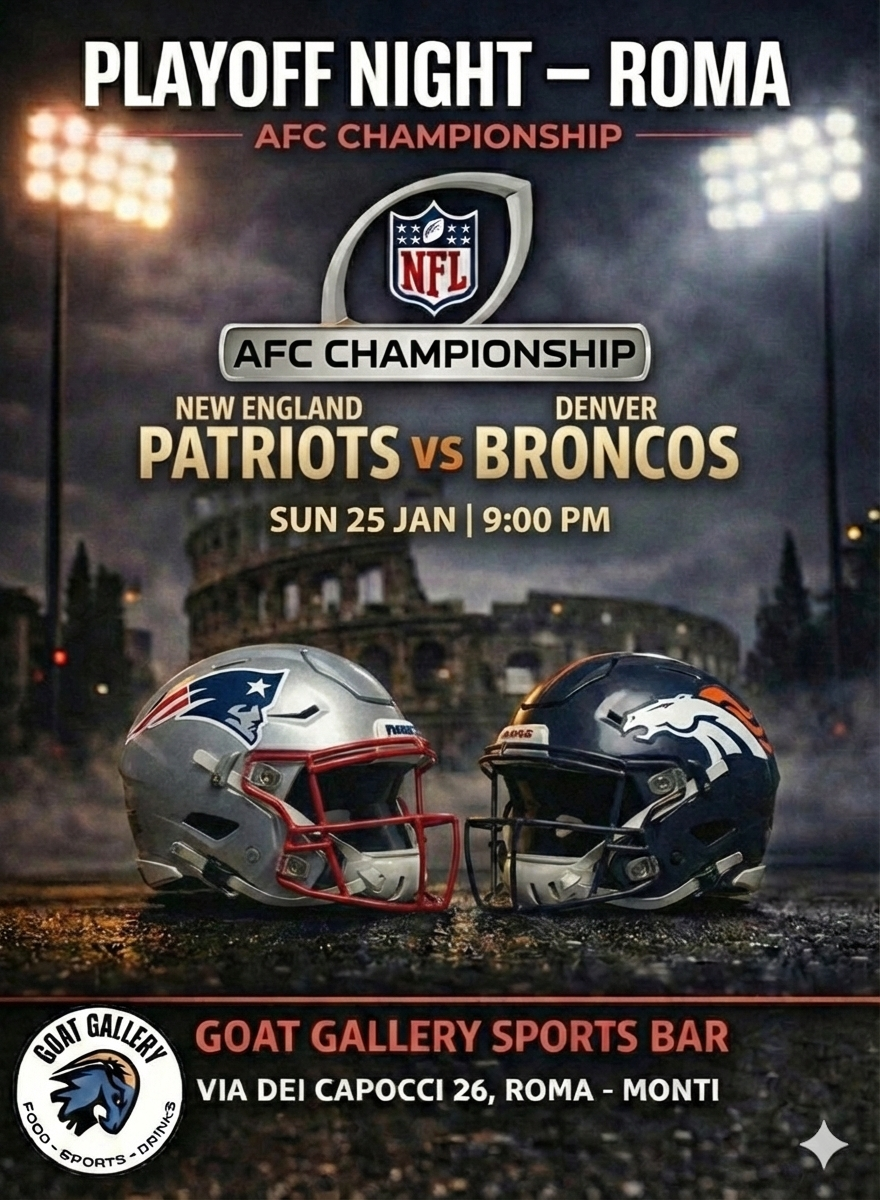 Watch the action live at Goat Gallery Sports Bar in central Rome, featuring multiple large TVs, American-inspired food, cold beer, great drinks and a comfortable setting designed for an immersive game-night experience.