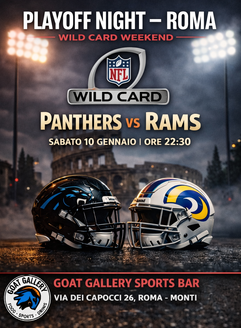 Vivi l’evento live con lo streaming della partita al Goat Gallery Sports Bar, nel cuore di Roma, tra schermi, american food e fans per un’atmosfera da perfetta game night.