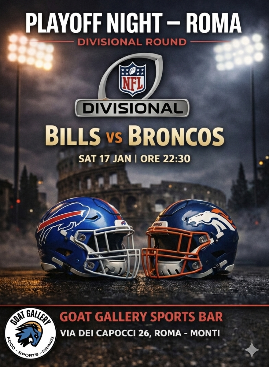 Experience the game live at Goat Gallery Sports Bar in the heart of Rome, with large screens, full game streaming, and a relaxed sports-bar atmosphere — ideal for enjoying NFL playoff action with great food and drinks.